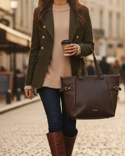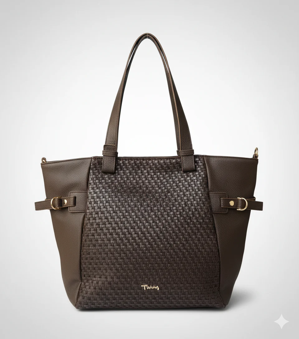 Ευρύχωρη τσάντα ώμου από δέρμα και μαλακό τεχνόδερμα με το σήμα THIROS και με διακριτικές χρυσές λεπτομέρειες. Διαθέτει εσωτερική θήκη, διακοσμητικά λουράκια στο πλάι, είναι φοδραρισμένη και κλείνει με φερμουάρ.