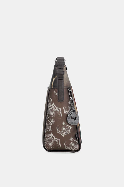 Μεταλλικό charm στην όψη της τσάντας , καθώς και ιδιαίτερο patern με ανάγλυφα στοιχεία τυπωμένα.